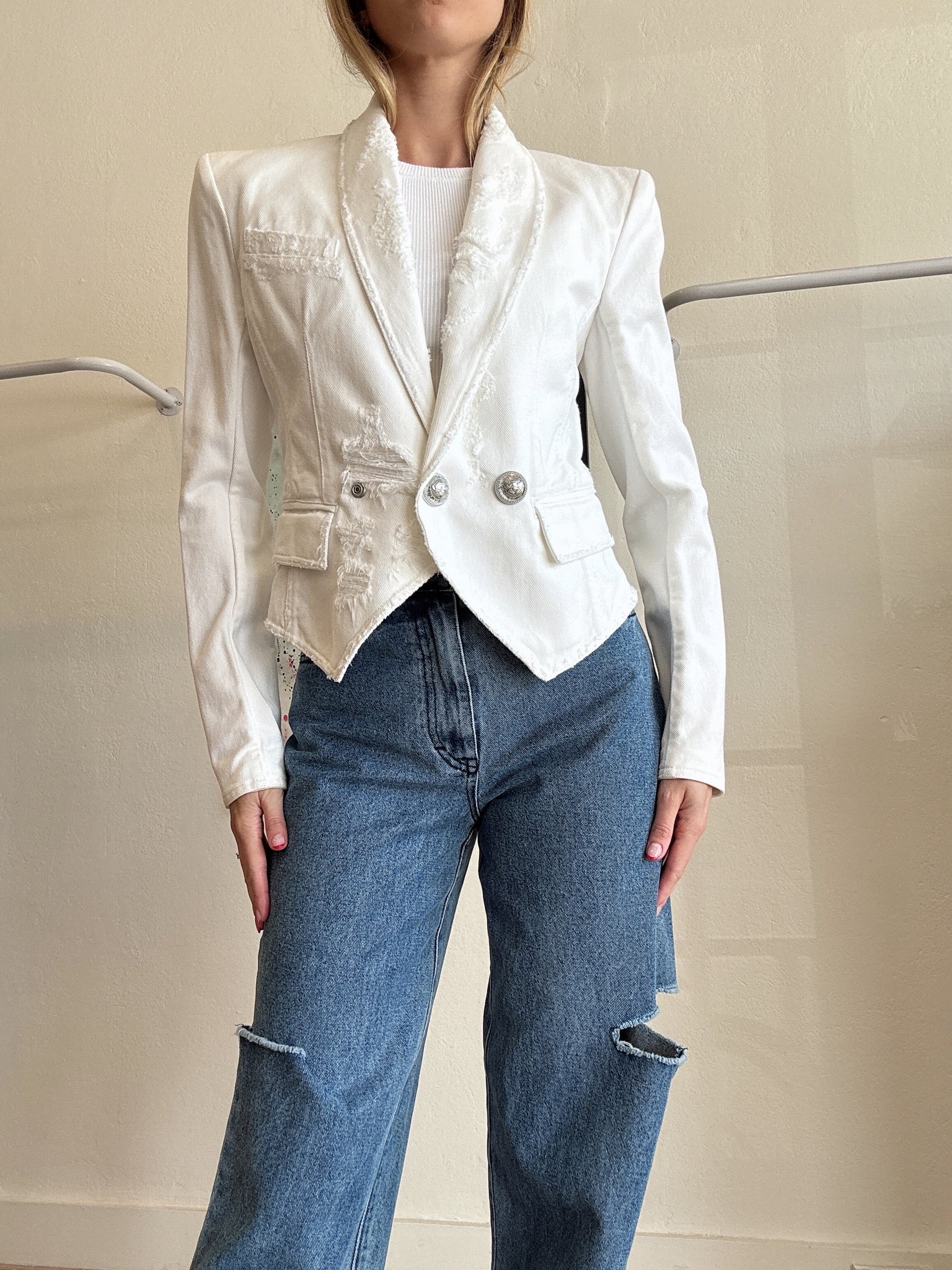 Balmain Paris - Distress Tux Style Denim Jacket - Ivory - 38 - RRP$2790