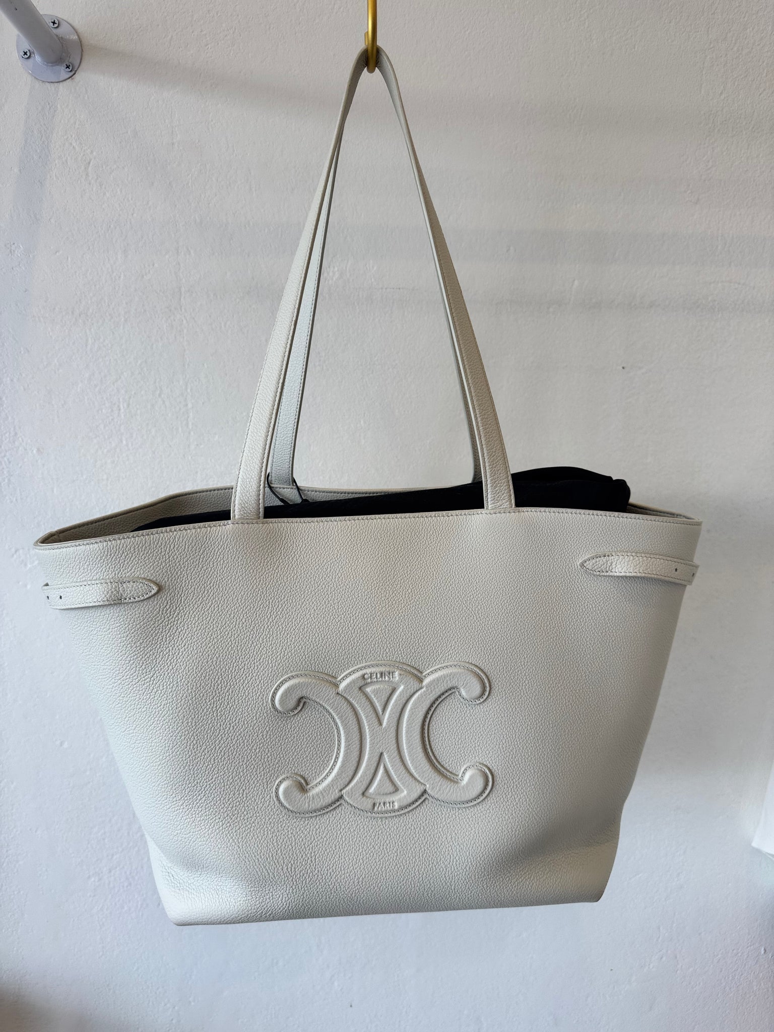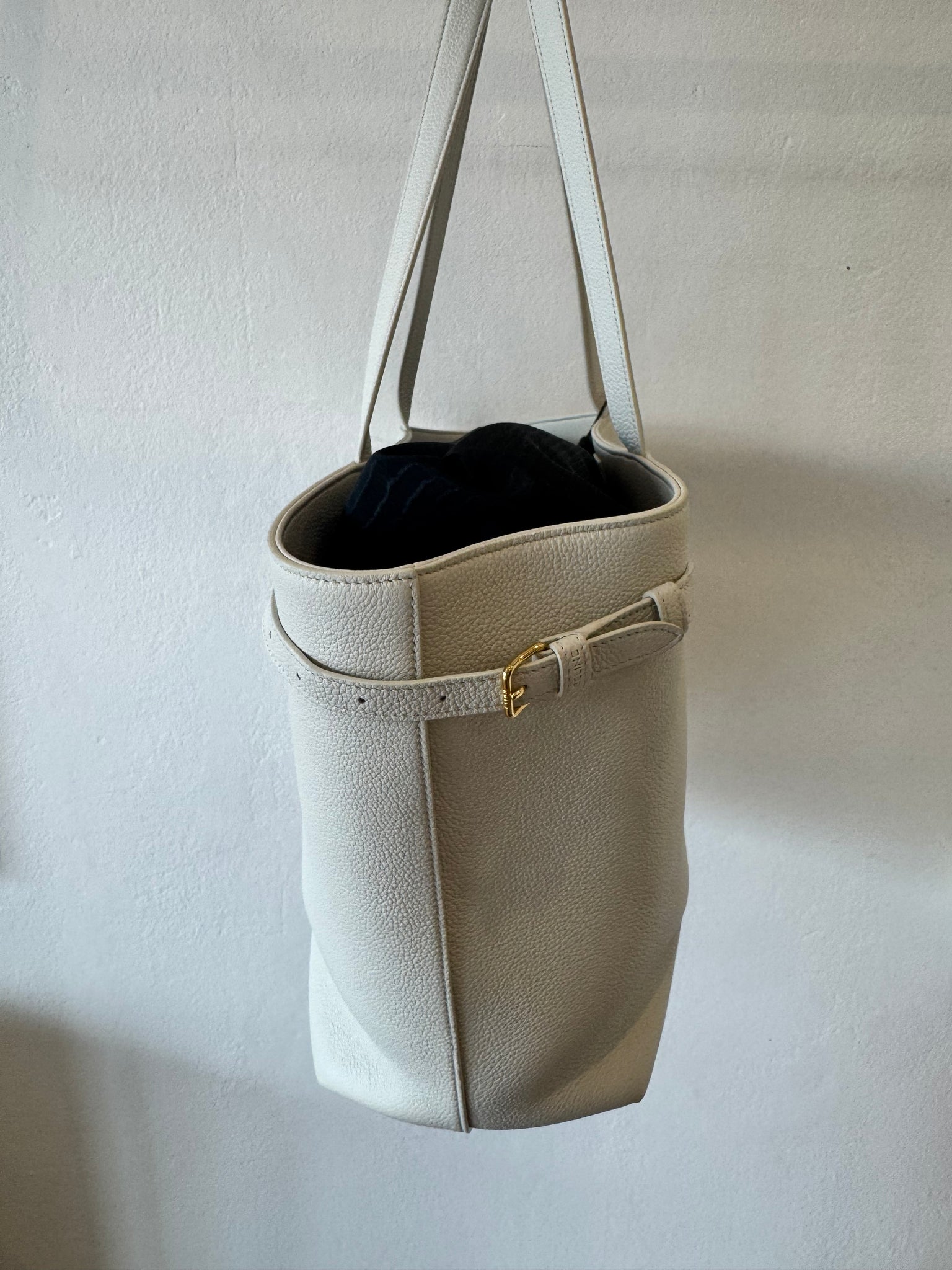Functional leather belts on the sides to tighten the bag