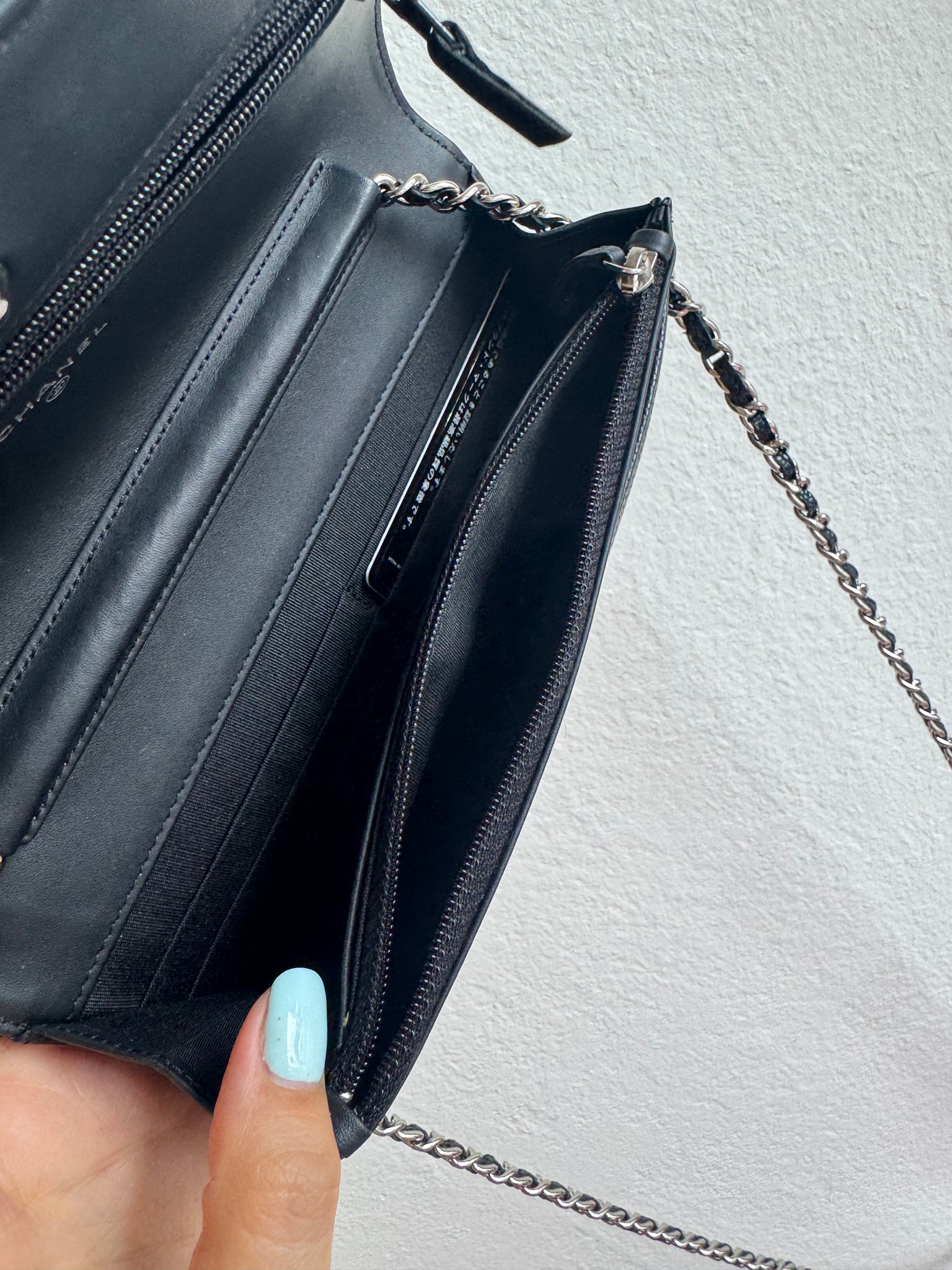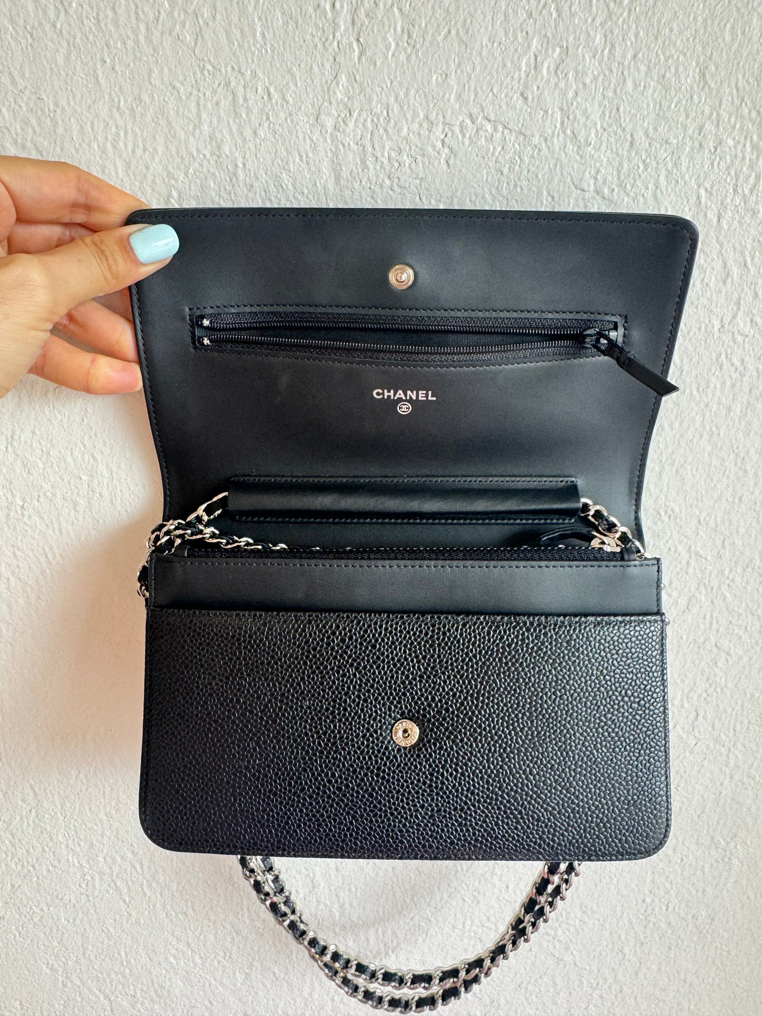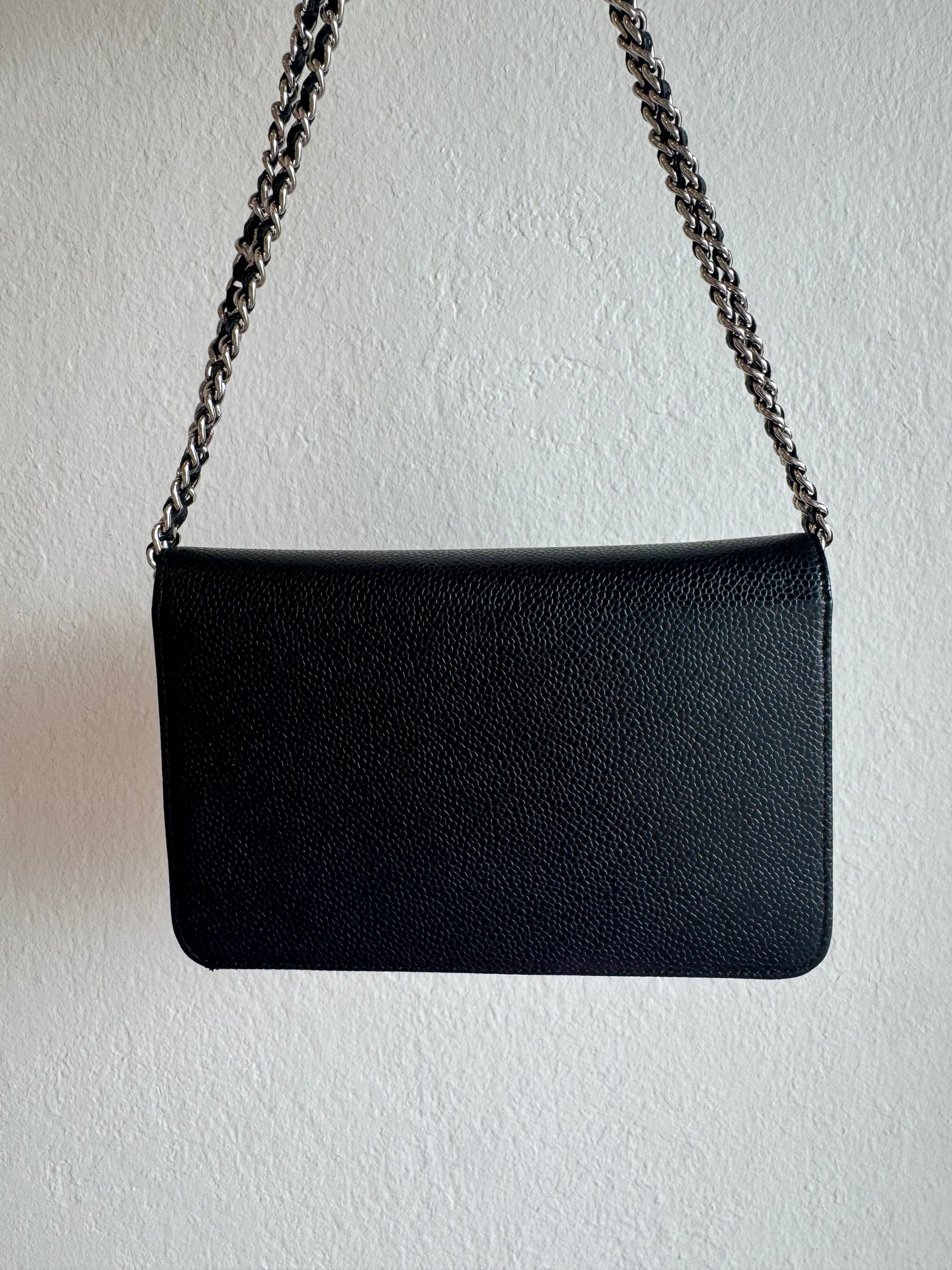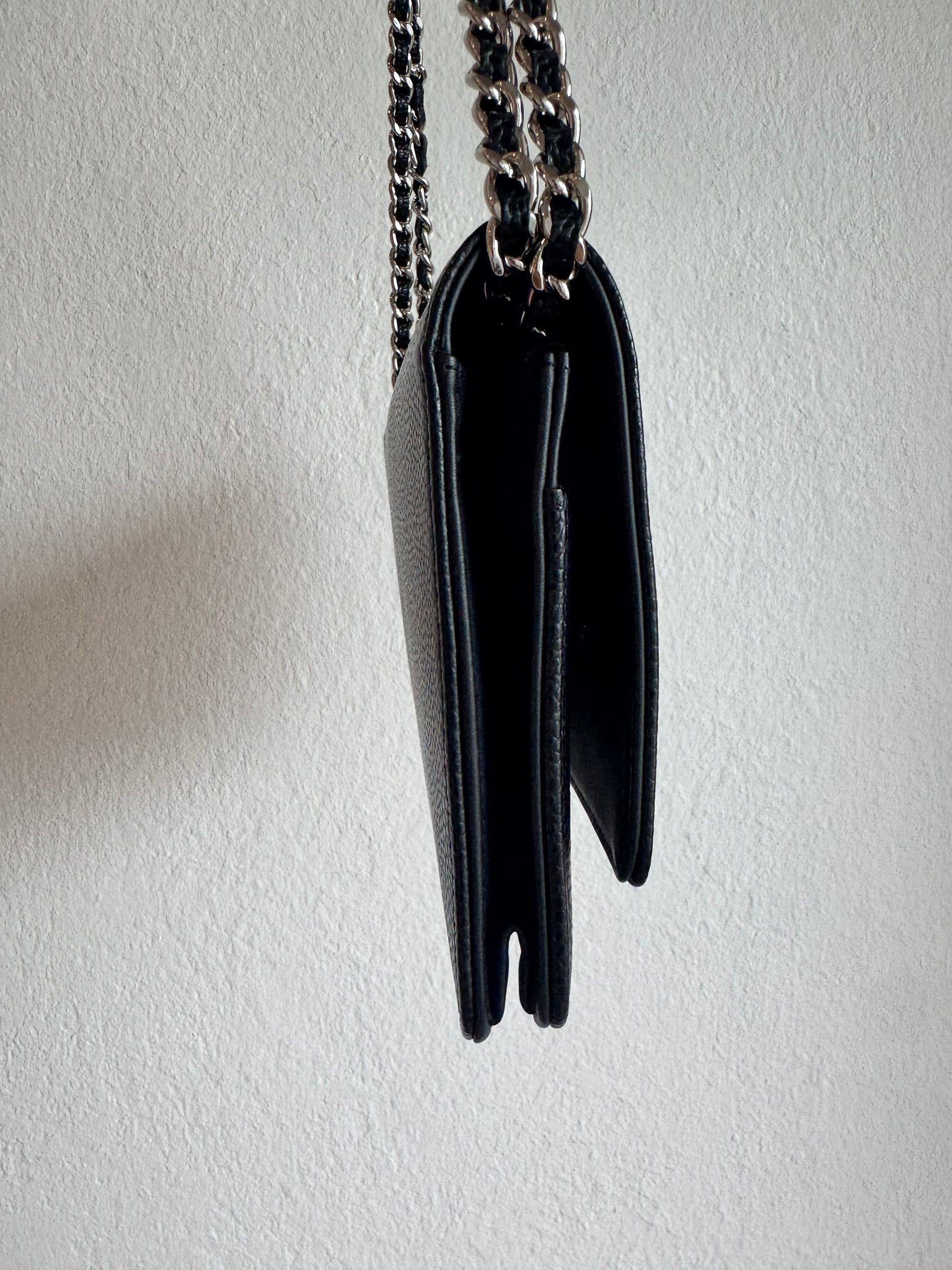 Black quilted caviar leather exterior. Silver tone hardware including CC logo. Chain & leather interwoven sliding strap & top flap. Internal front slip pocket, interior zipped pocket & six card slots.