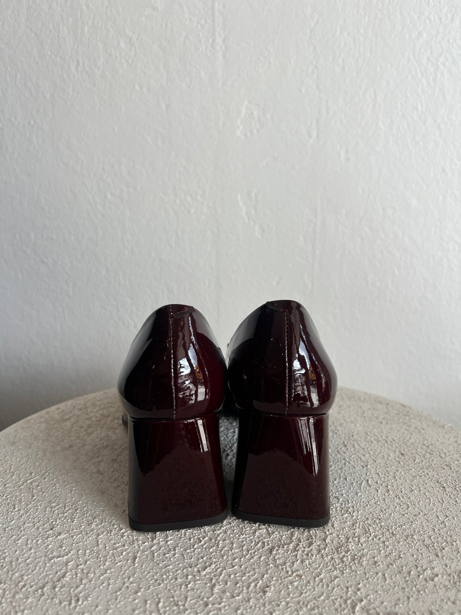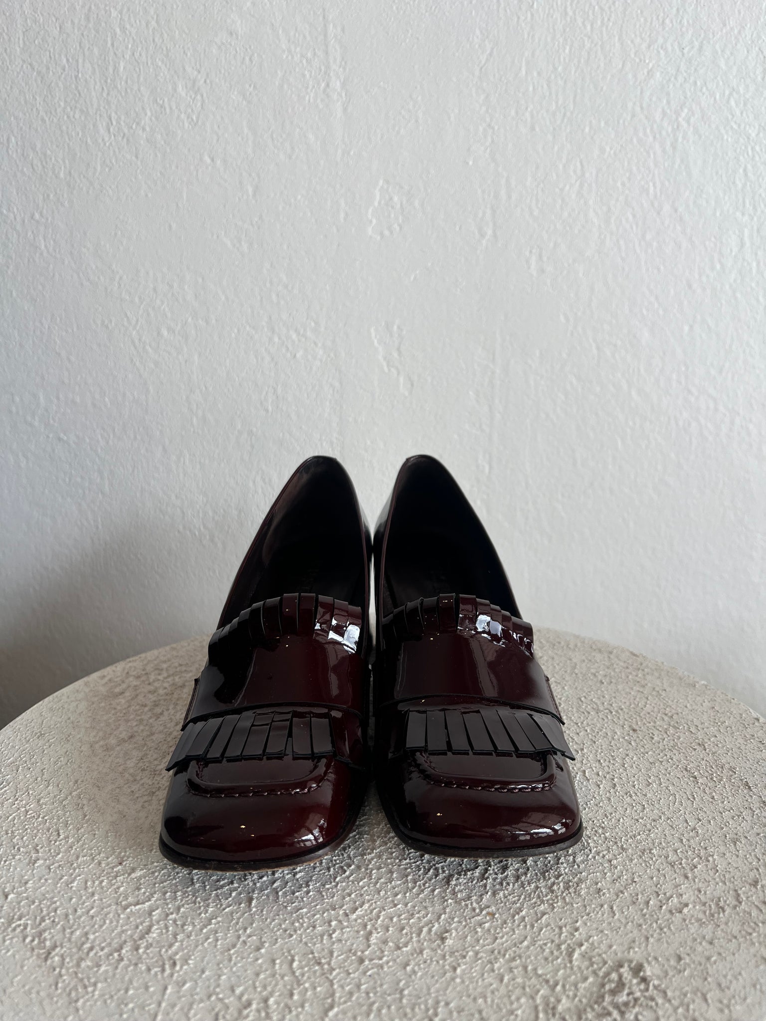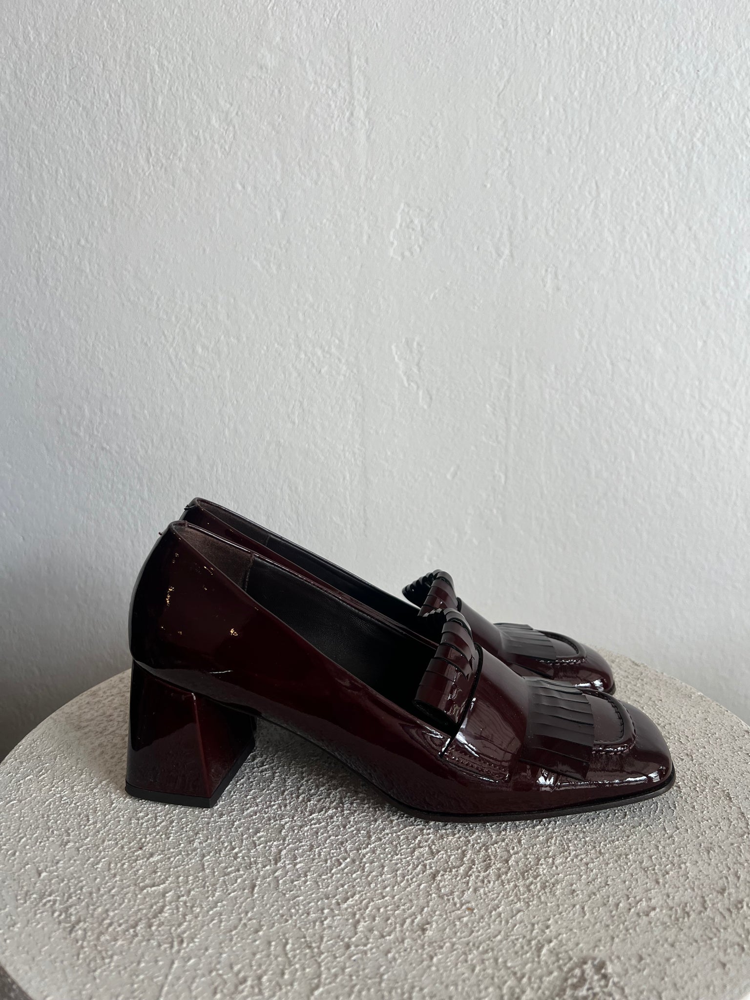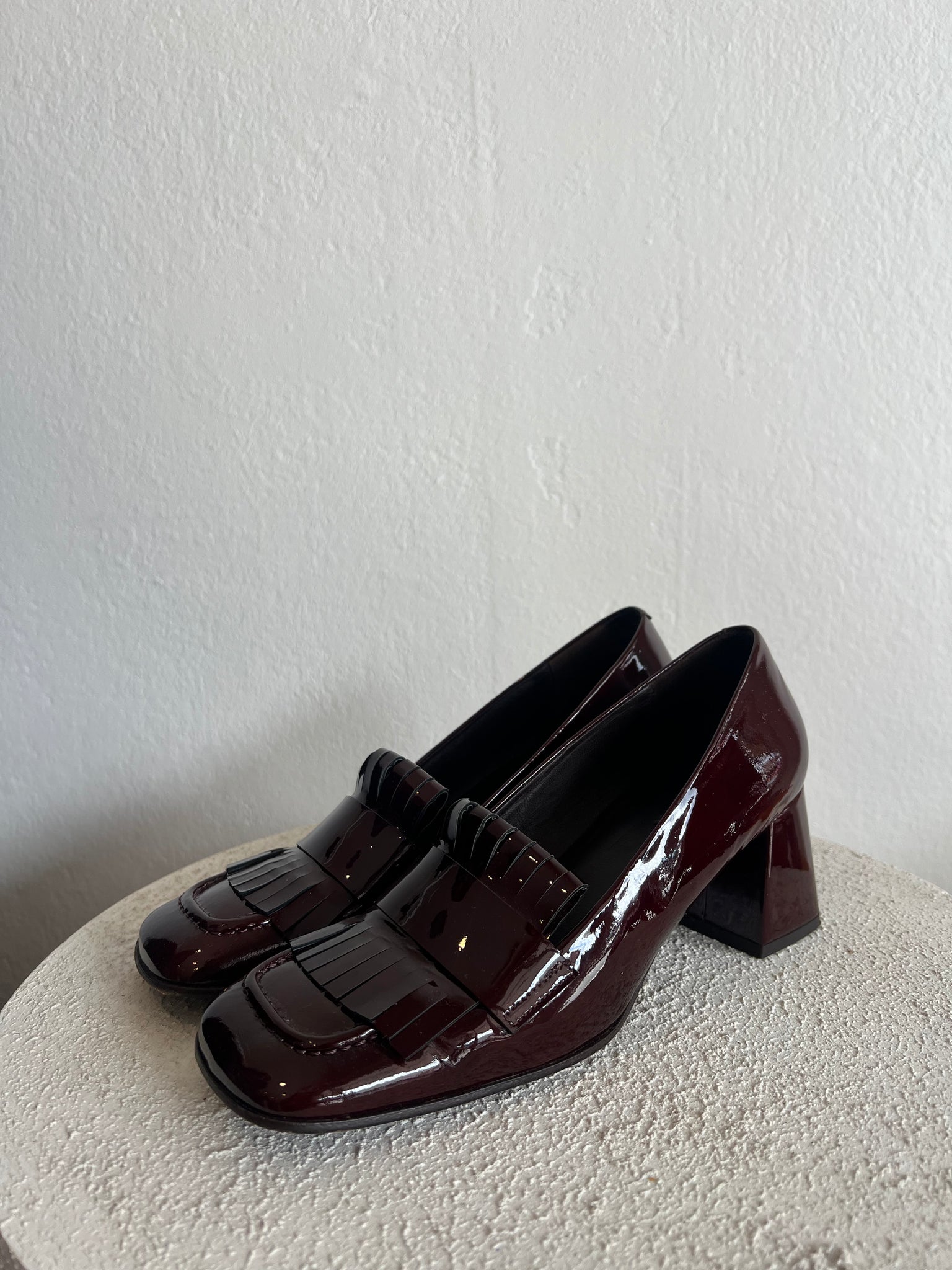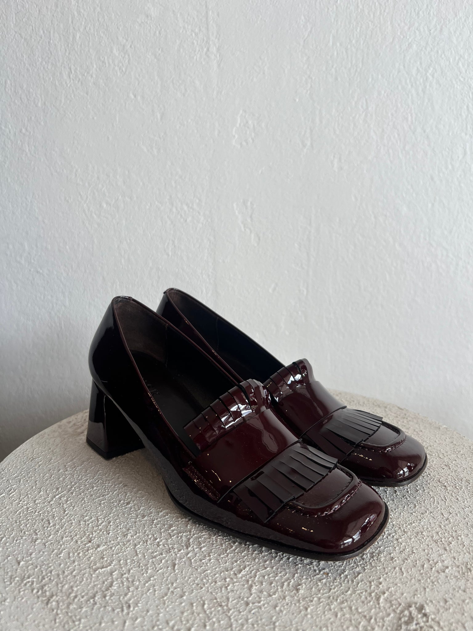 Husk - Tasselled Court Shoe w Block Heel - Patent Deep Burgundy - 39 - RRP$599