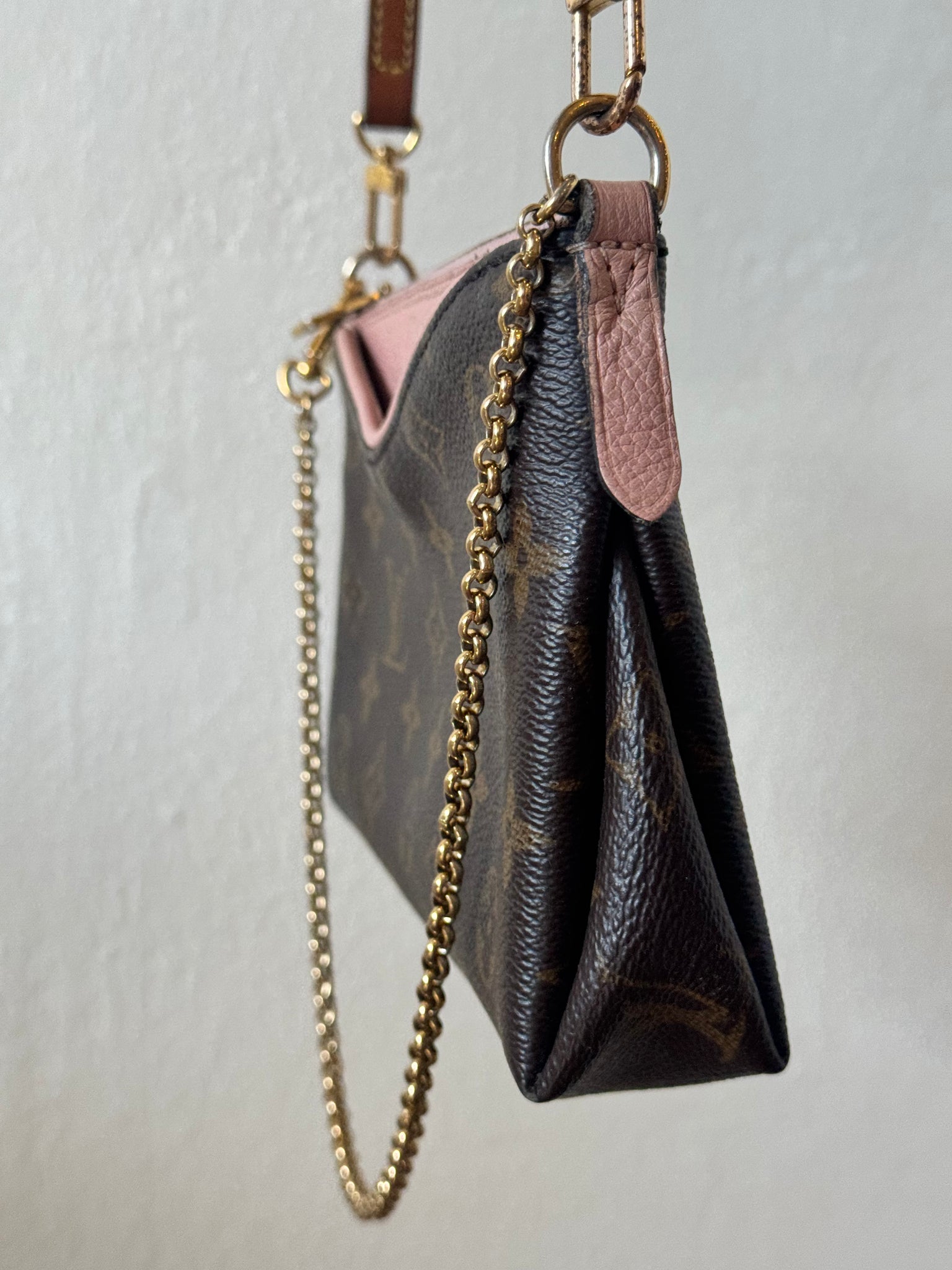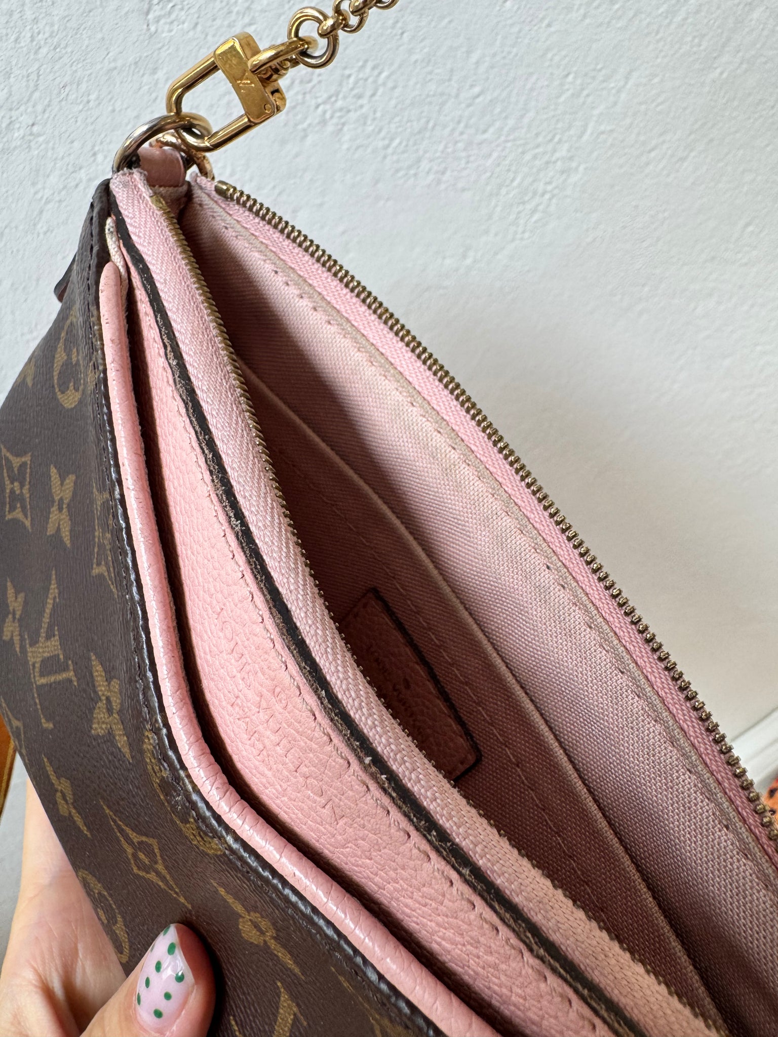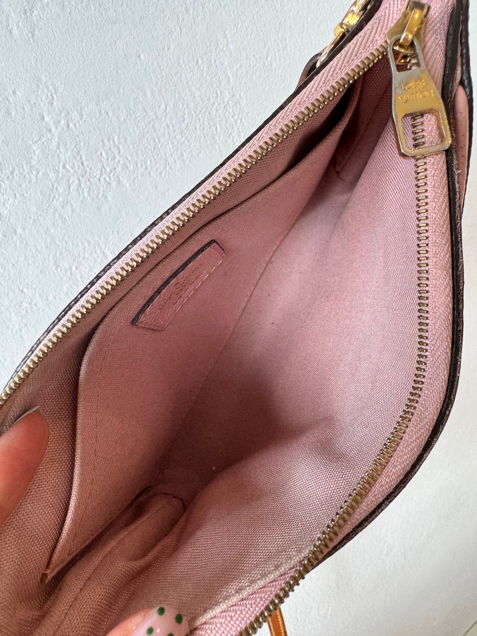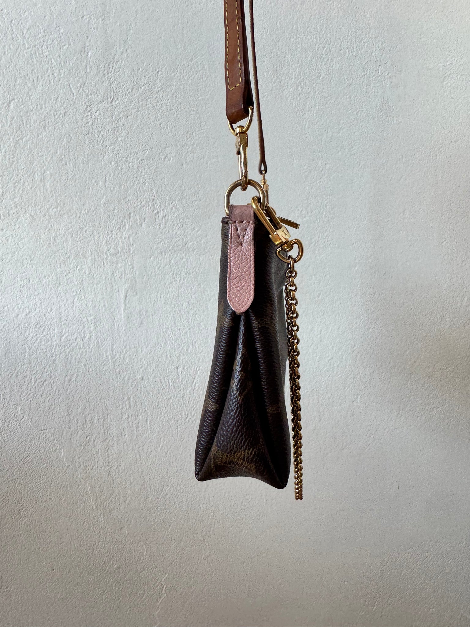 Features: Monogram coated canvas exterior; pink grained leather trim; front exterior slip pocket; gold tone hardware; chain strap; detachable leather shoulder strap; top zip opening; pink textile lined interior; 1 x slip pocket.