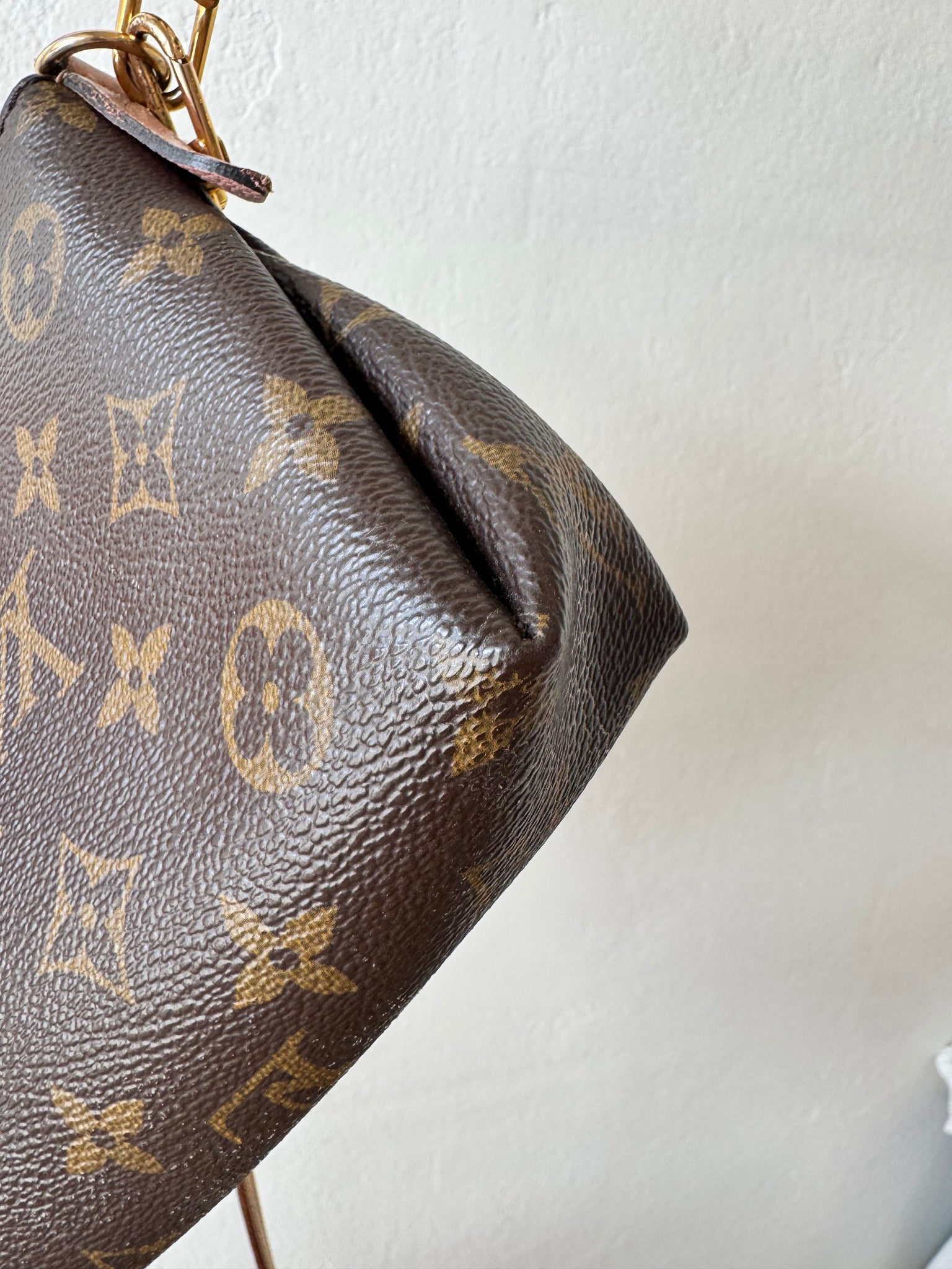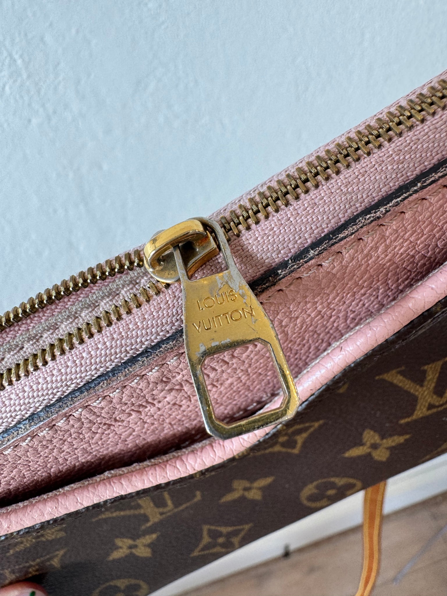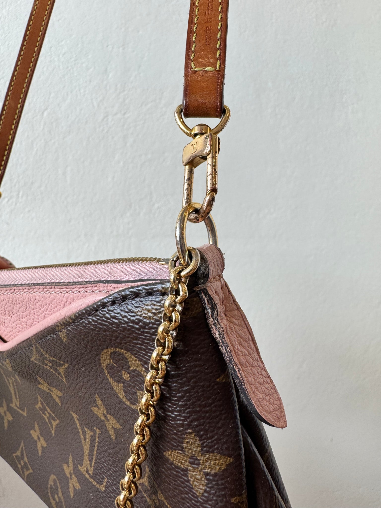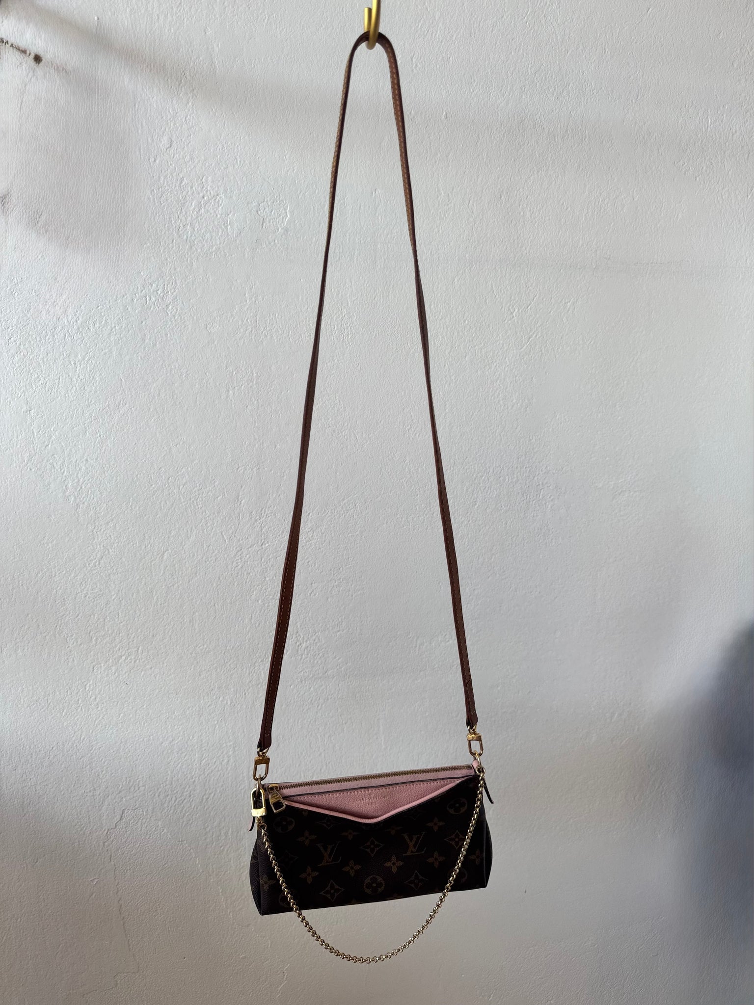 Features: Monogram coated canvas exterior; pink grained leather trim; front exterior slip pocket; gold tone hardware; chain strap; detachable leather shoulder strap; top zip opening; pink textile lined interior; 1 x slip pocket.
