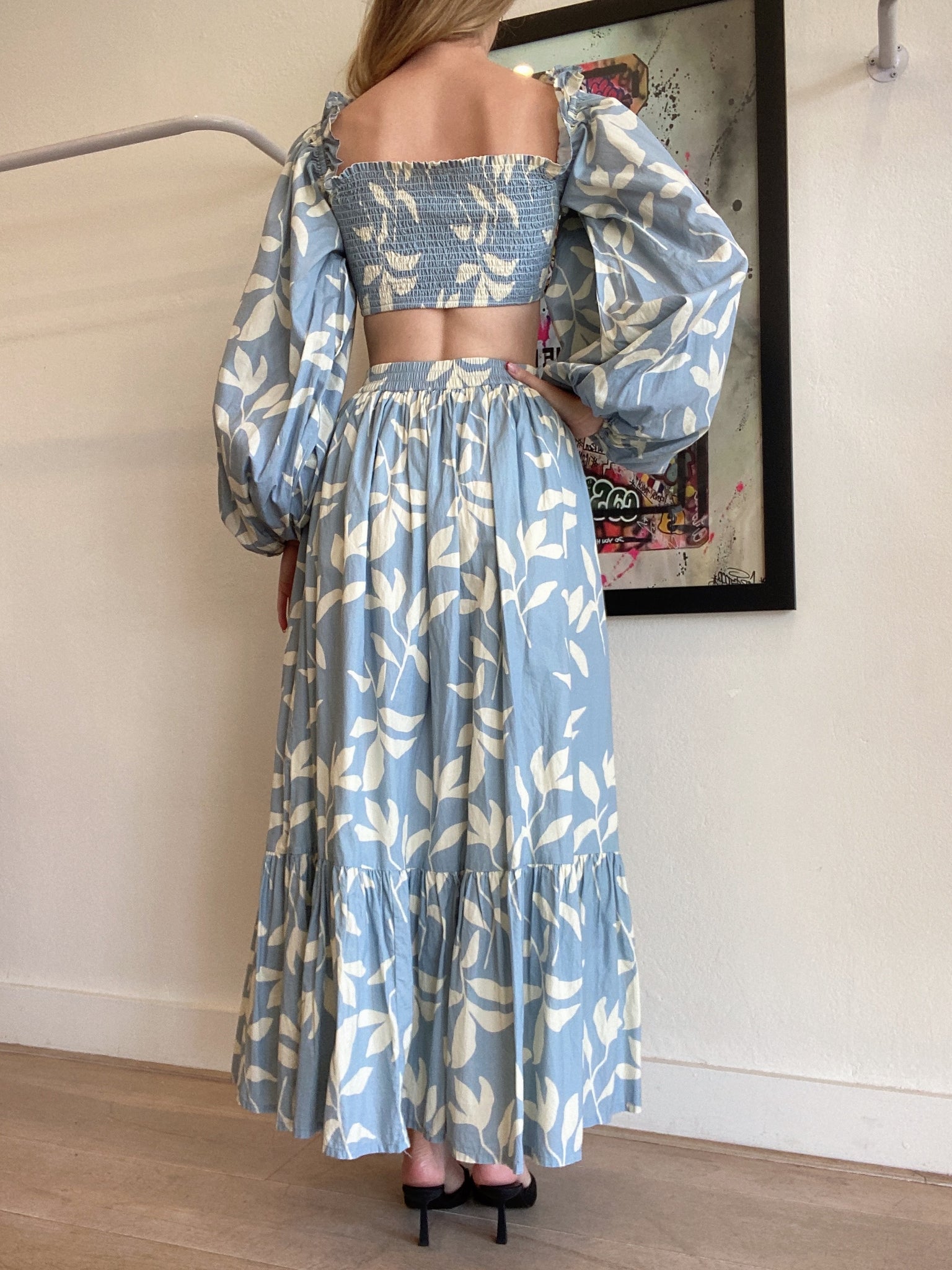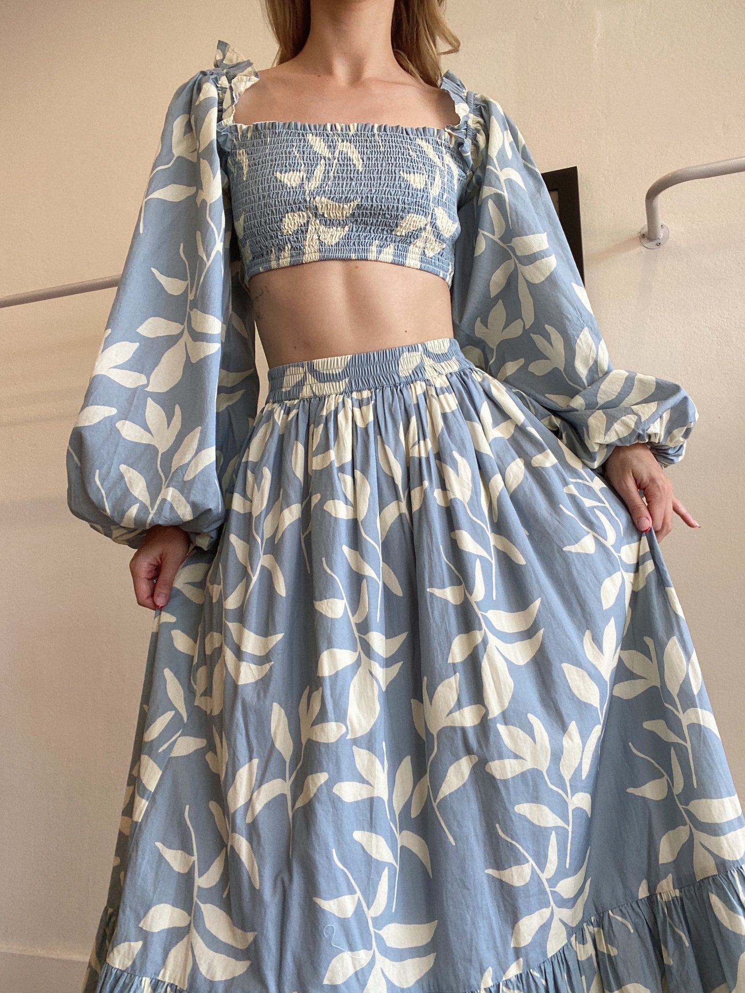 Palm Noosa - Rushed Top & Skirt Set - Blue w Ivory Leaf Print - 10