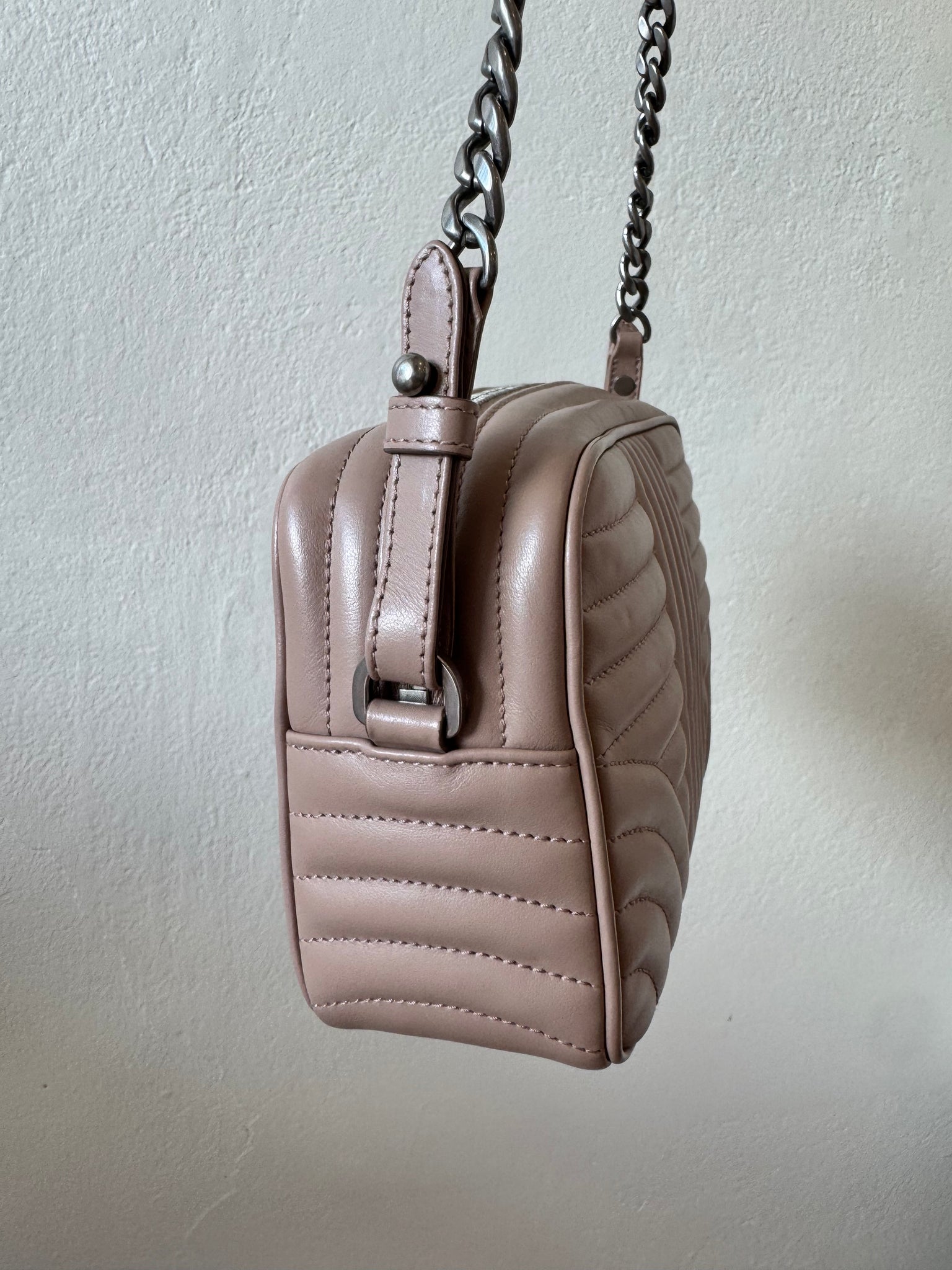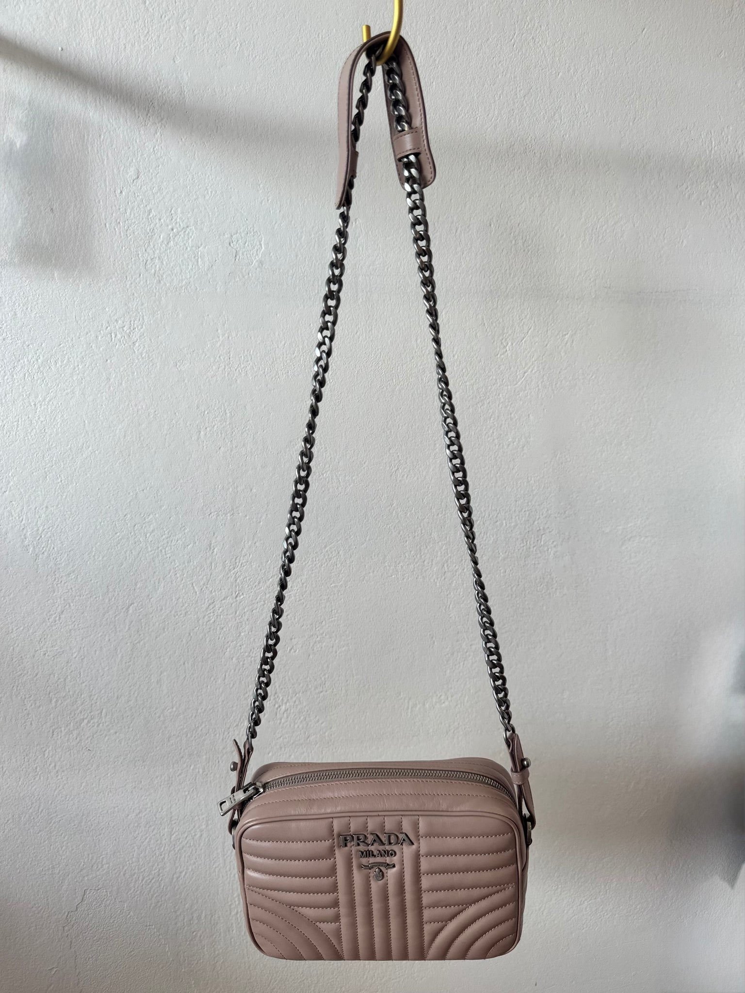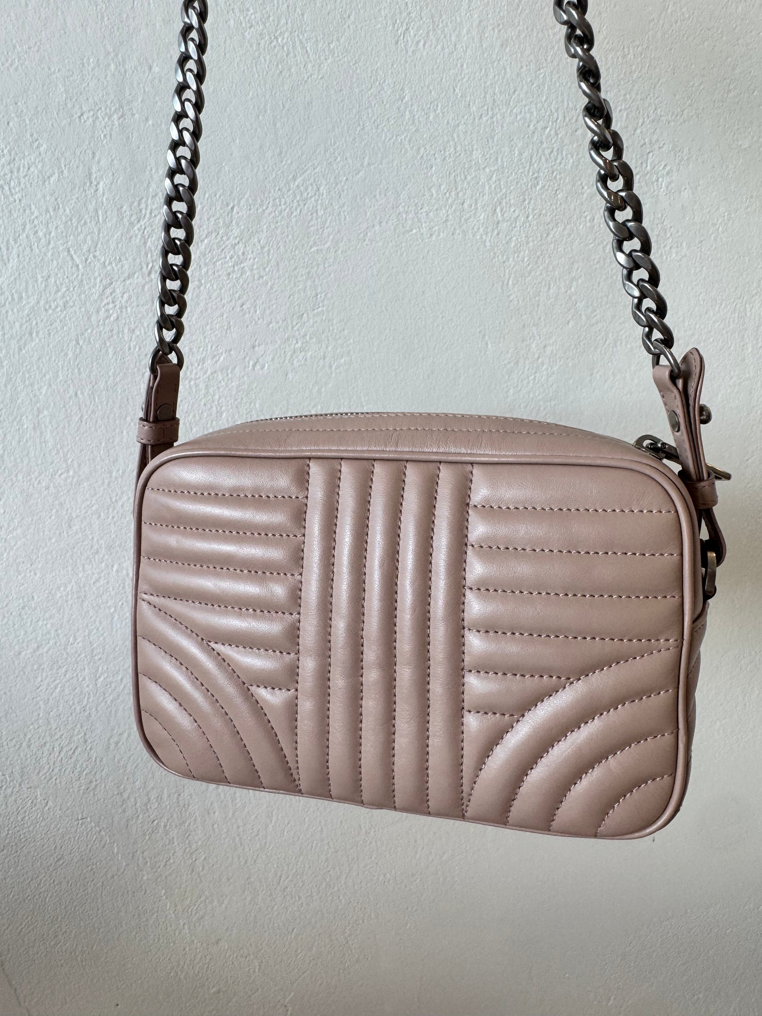 Features: Cipria dusty pink neutral quilted soft calf leather exterior; silver tone hardware; chain-link shoulder strap with leather shoulder pad; top zip opening to main compartment; jacquard textile and leather lined interior with 1 x zip pocket and 1 x slip pocket.