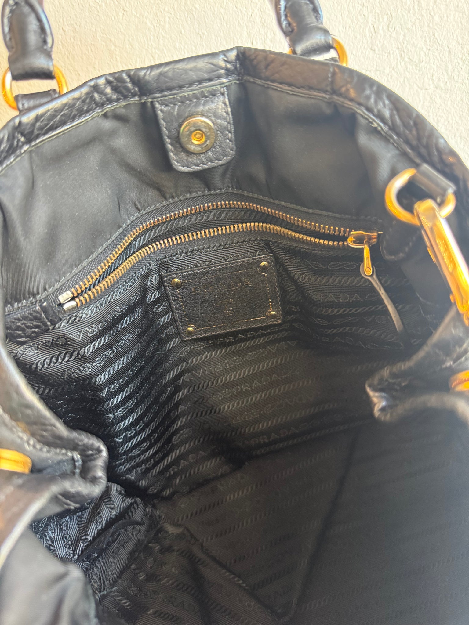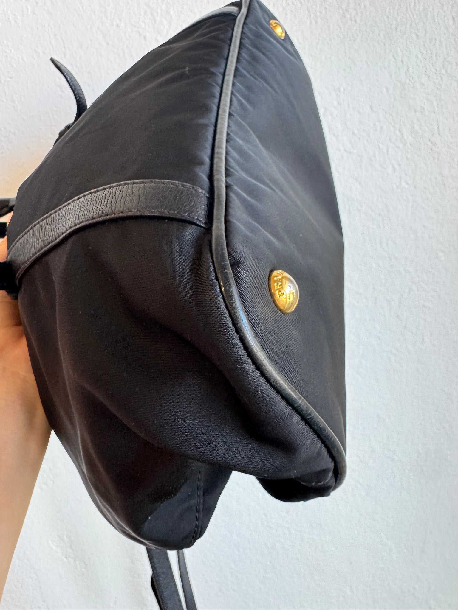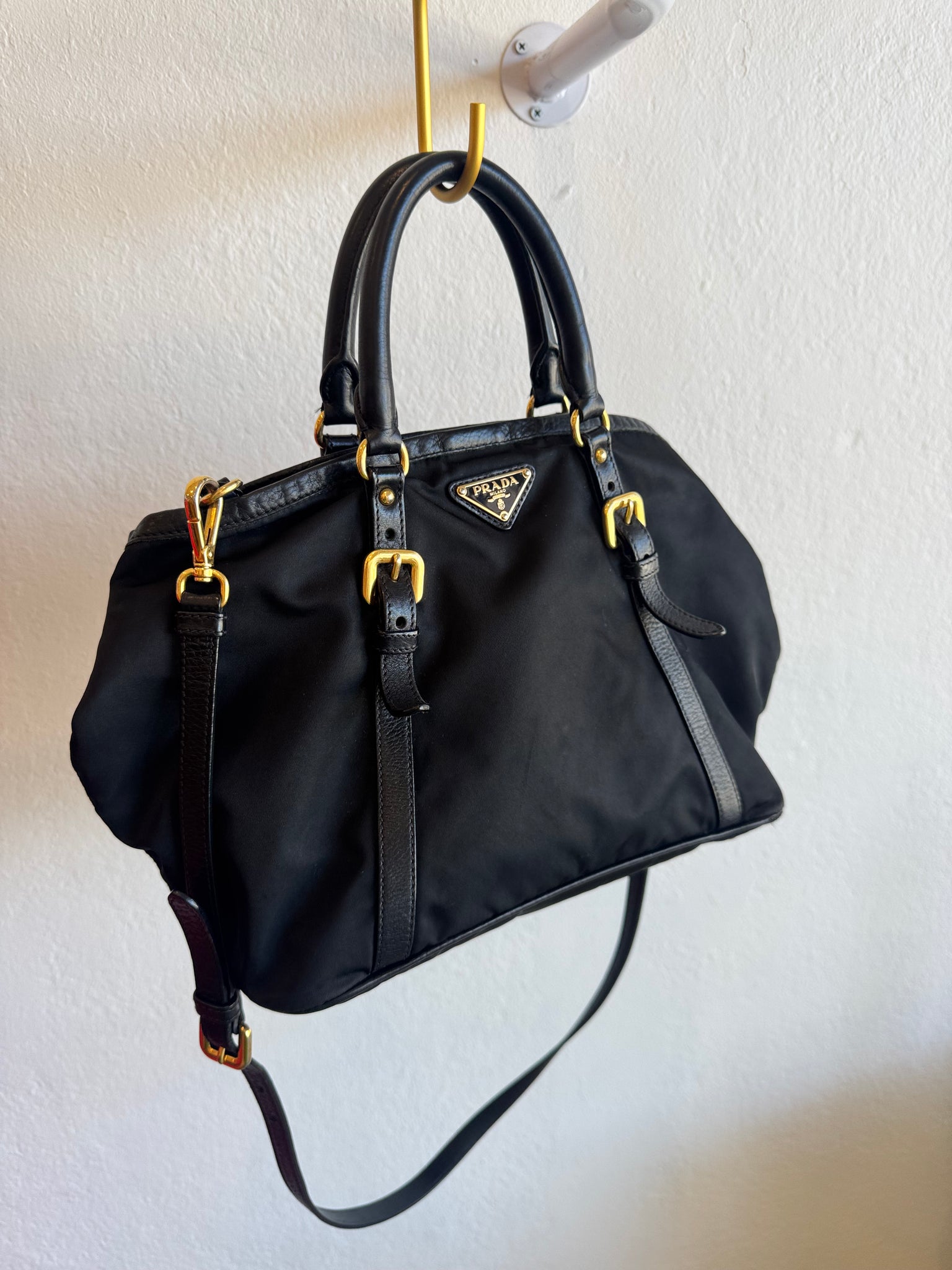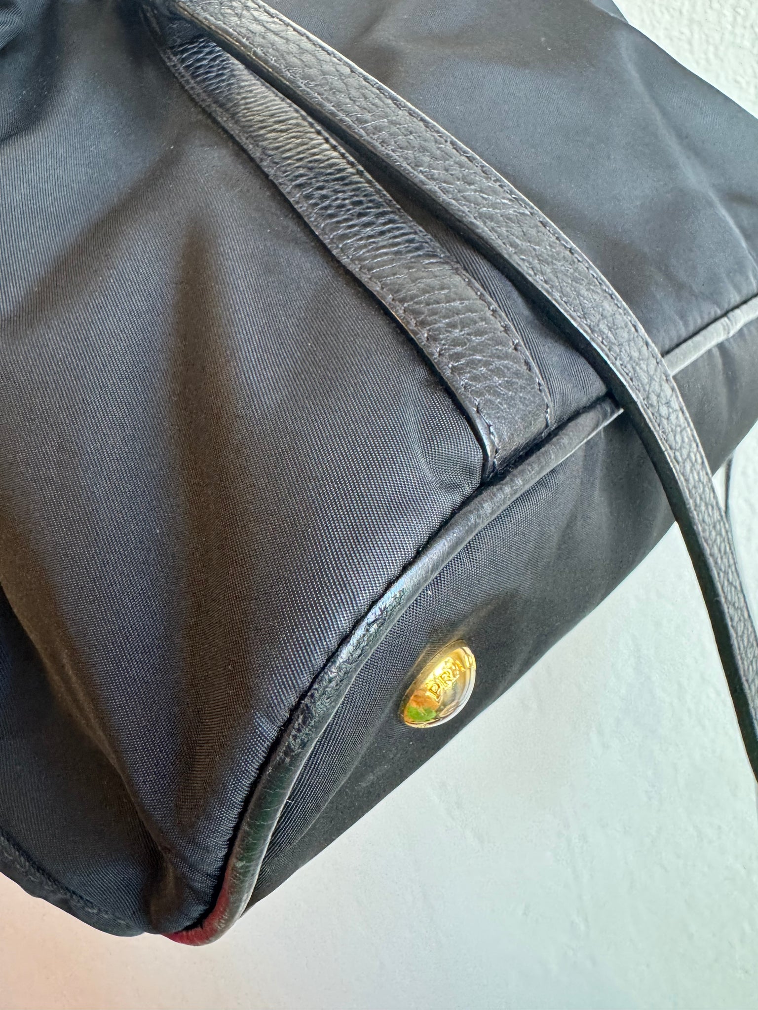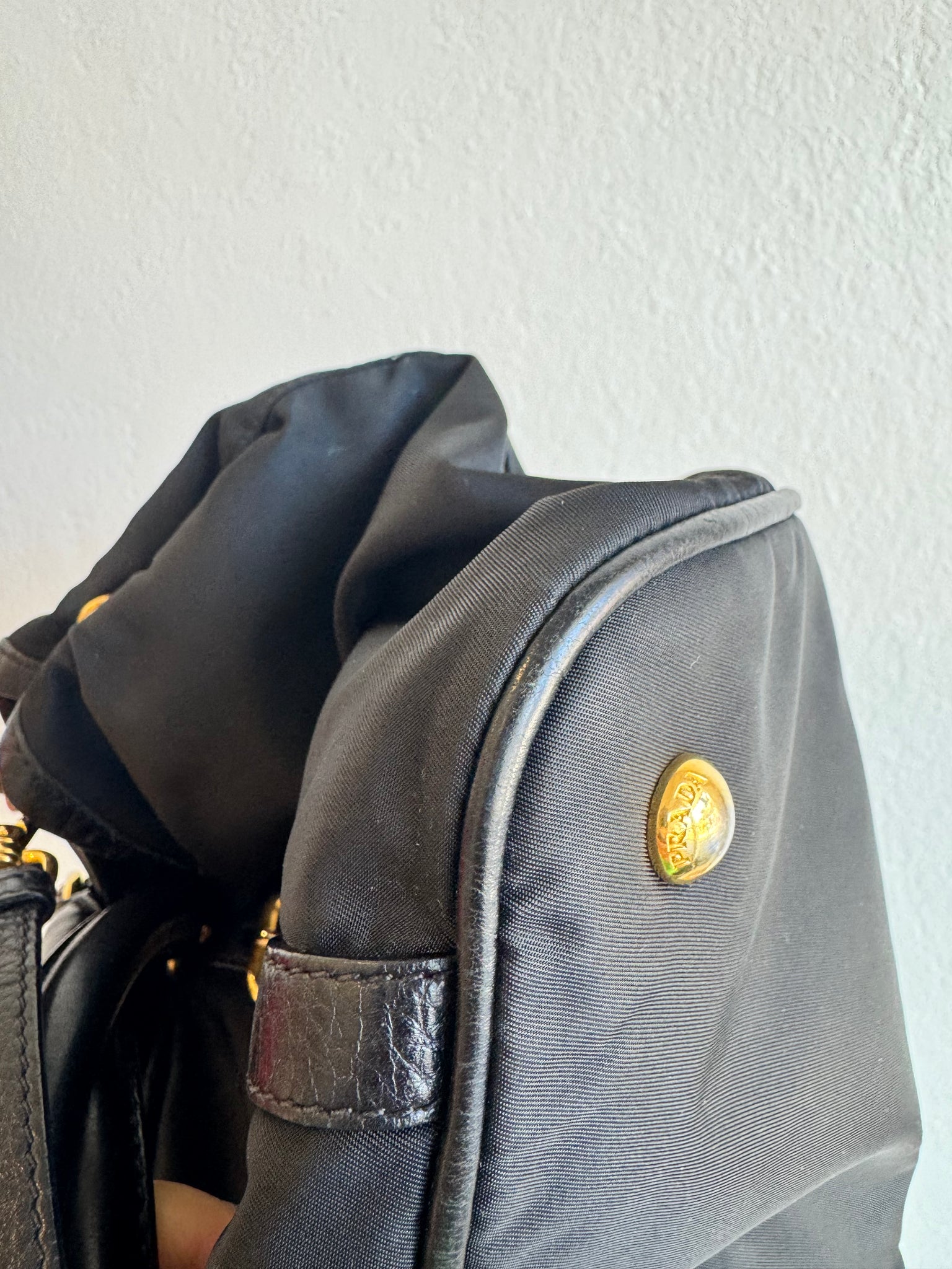 Nylon with Leather handles & trim. Gold Hardware & raised logo. Detachable long strap.